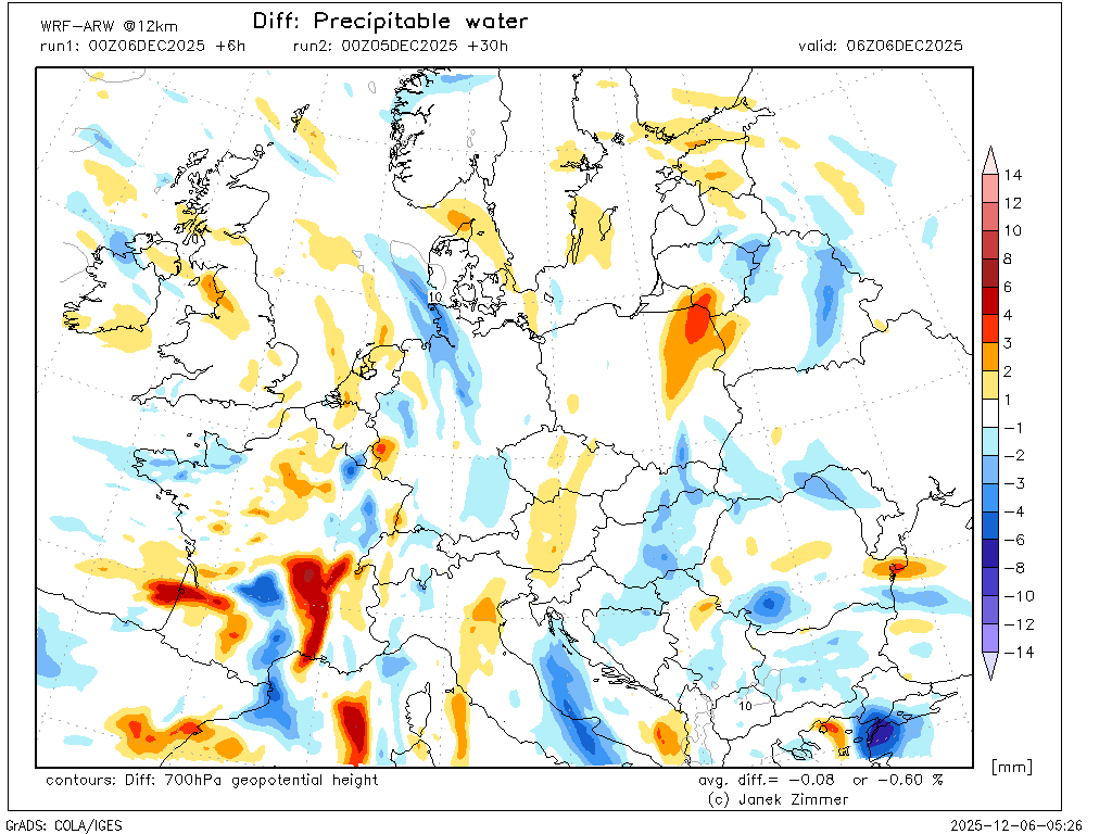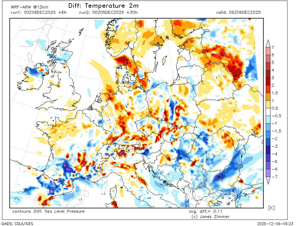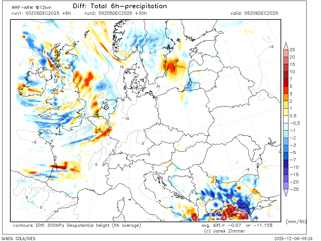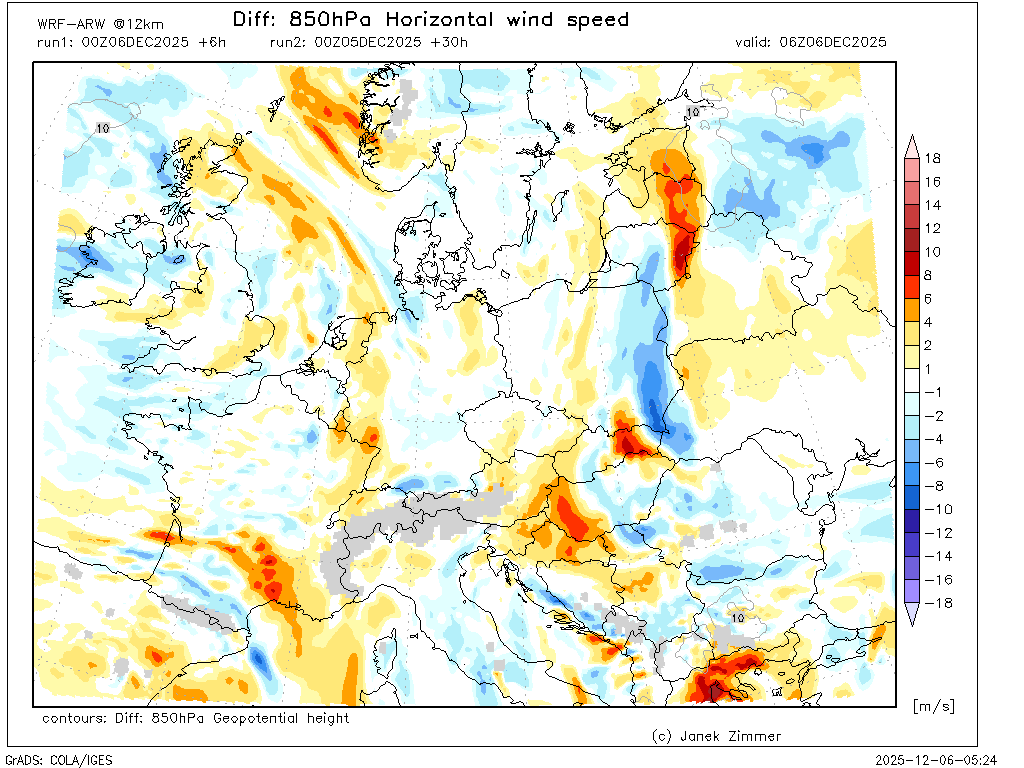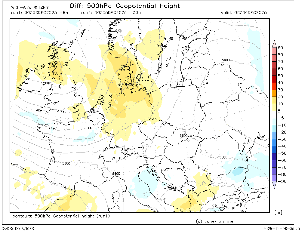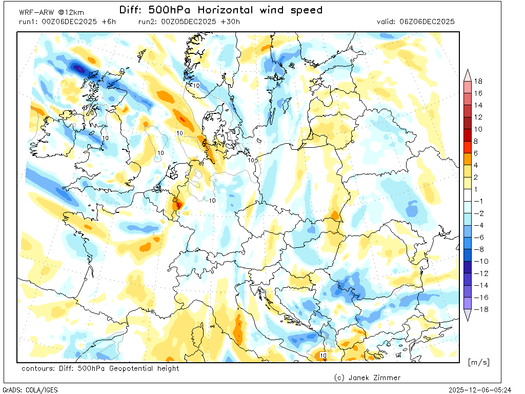 Run-to-run consistency: Difference 6h-forecast (today) minus 30h-forecast (yesterday's run)