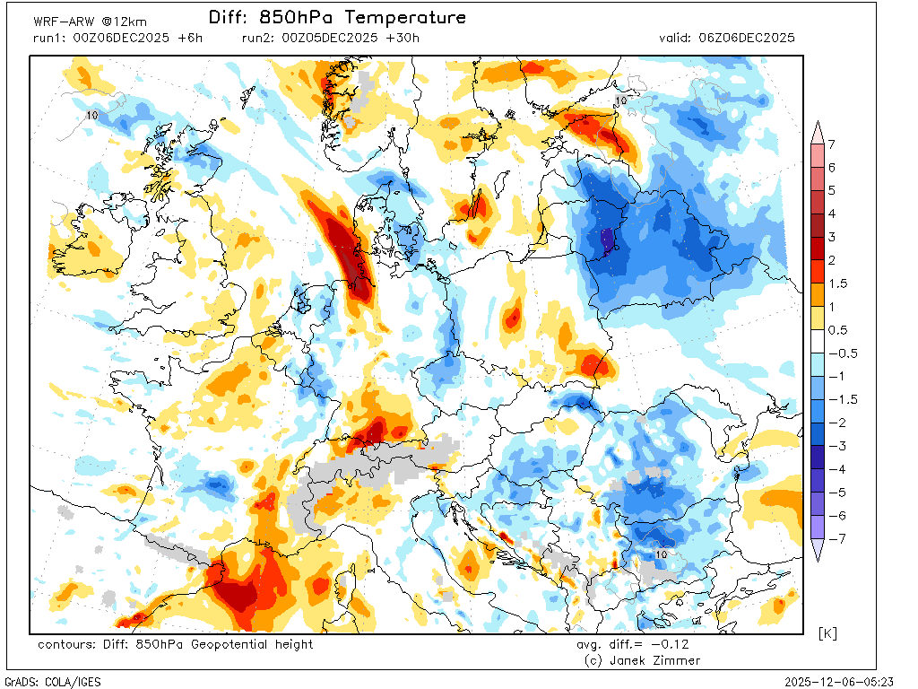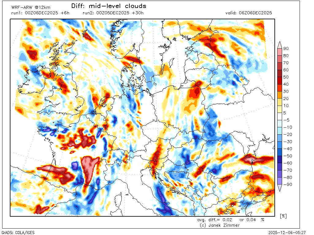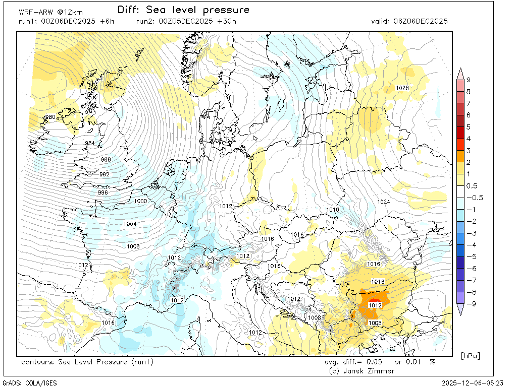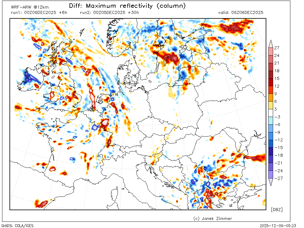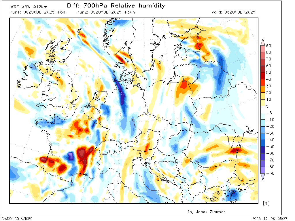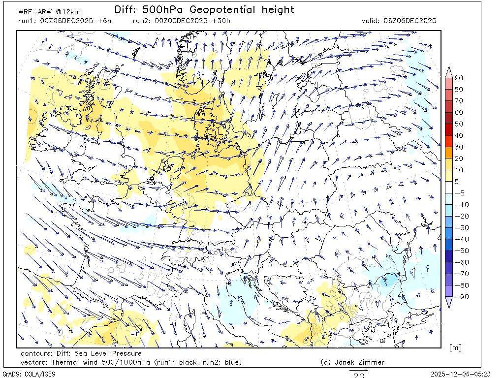 Run-to-run consistency: Difference 6h-forecast (today) minus 30h-forecast (yesterday's run)