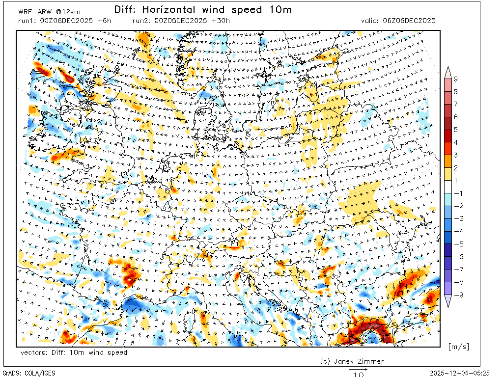 Lauf-zu-Lauf Konsistenz: Differenz 6h-Vorhersage (heute) minus 30h-Vorhersage (gestriger Lauf)